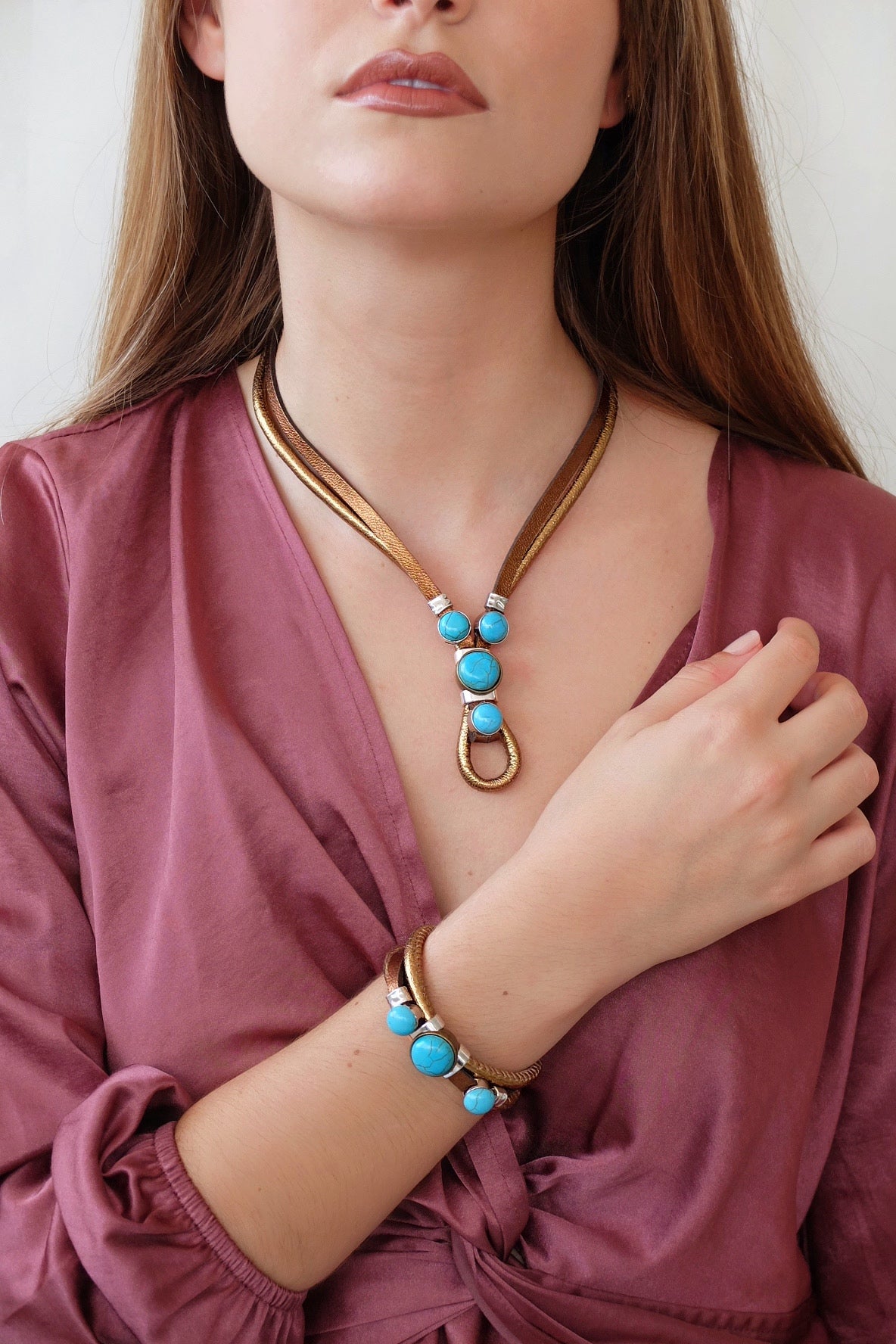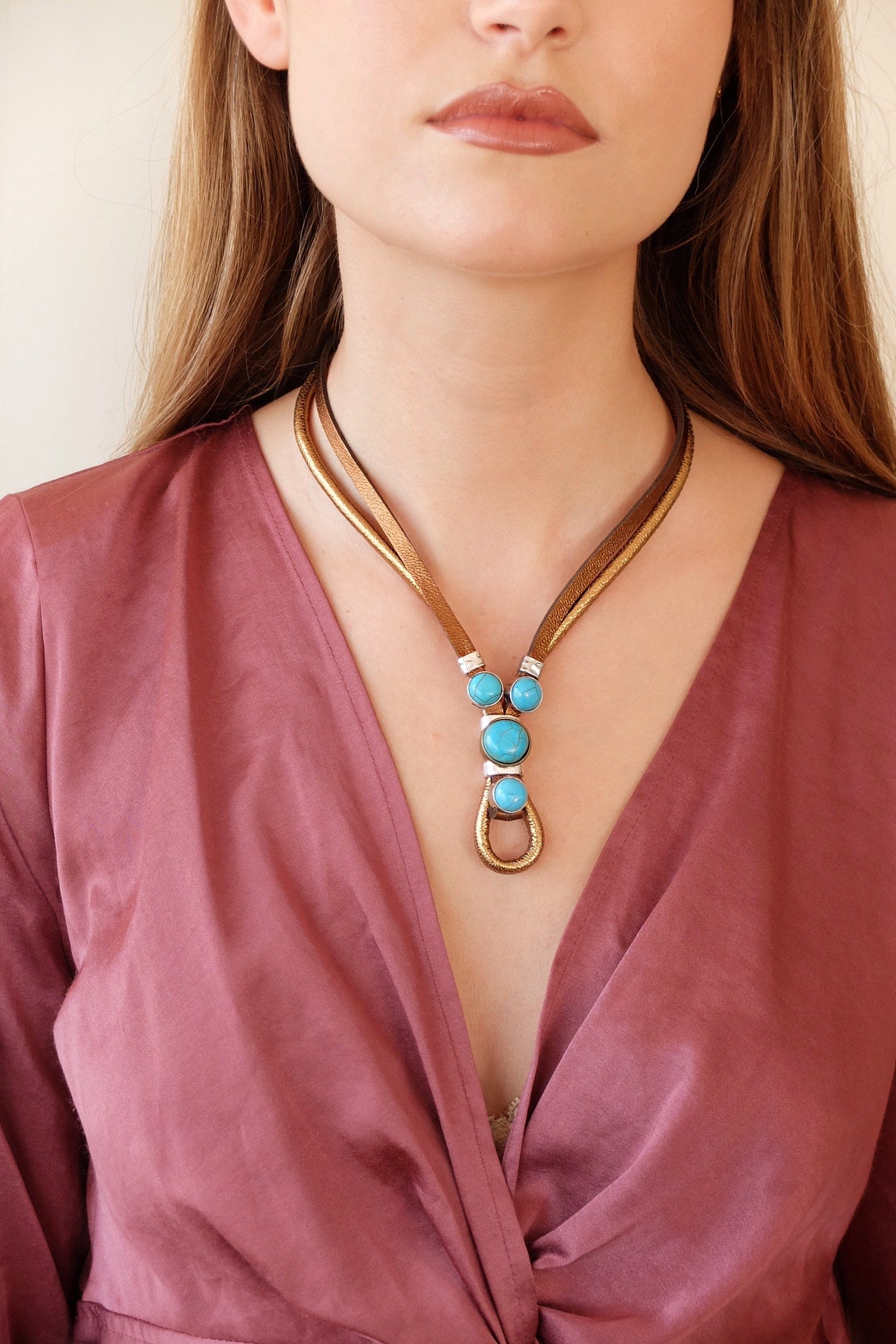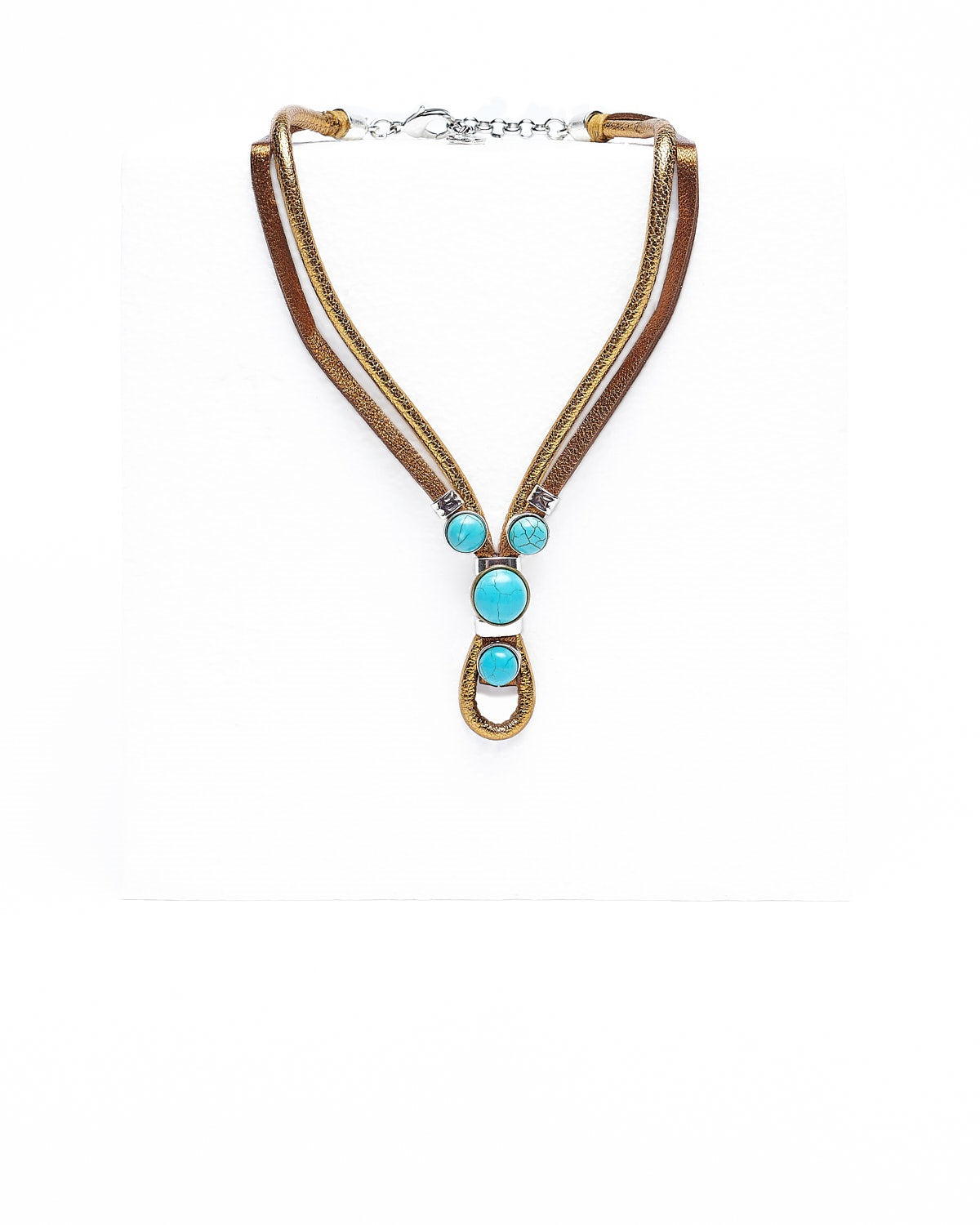 Este hermoso collar de cuero suave, oro y tiras bronce metalizados con piedras turquesa en el centro, hará que tu belleza natural brille aún más.