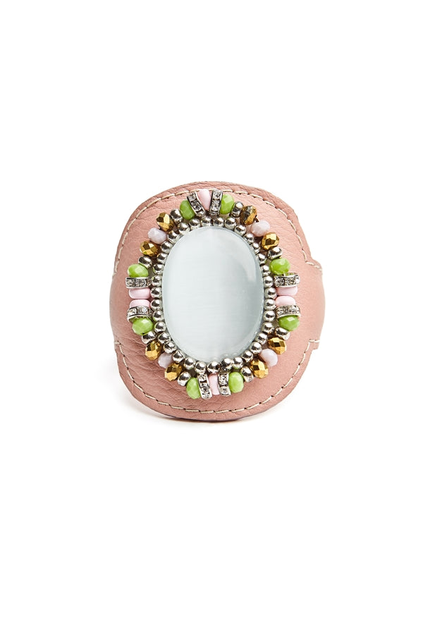 En su parte central, una piedra de ojo de gato con cristales y metal bañado en plata brilla con la intensidad del sol y su combinación de colores suaves nos transporta a la frescura de una tarde de verano.
