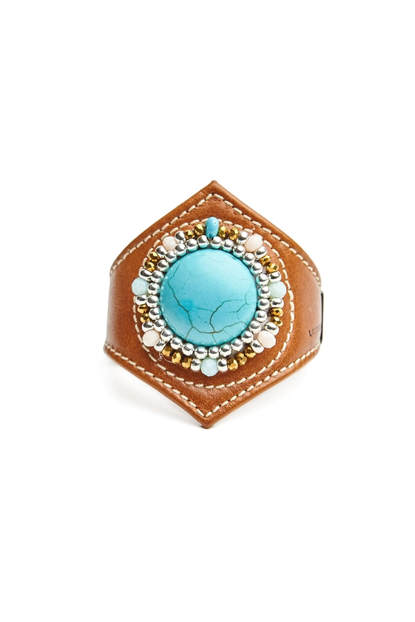 Con su turquesa central ornamentada con cristales de colores rosa y azul, este brazalete te hará sentir la suavidad de un atardecer en las playas.
