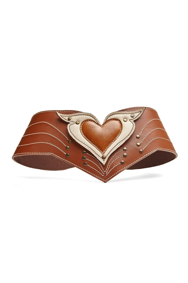 Con su corazón de marrón llamativo y la pieza superpuesta de color crudo con remaches, este cinturón es una pieza única que realzará tu figura femenina.