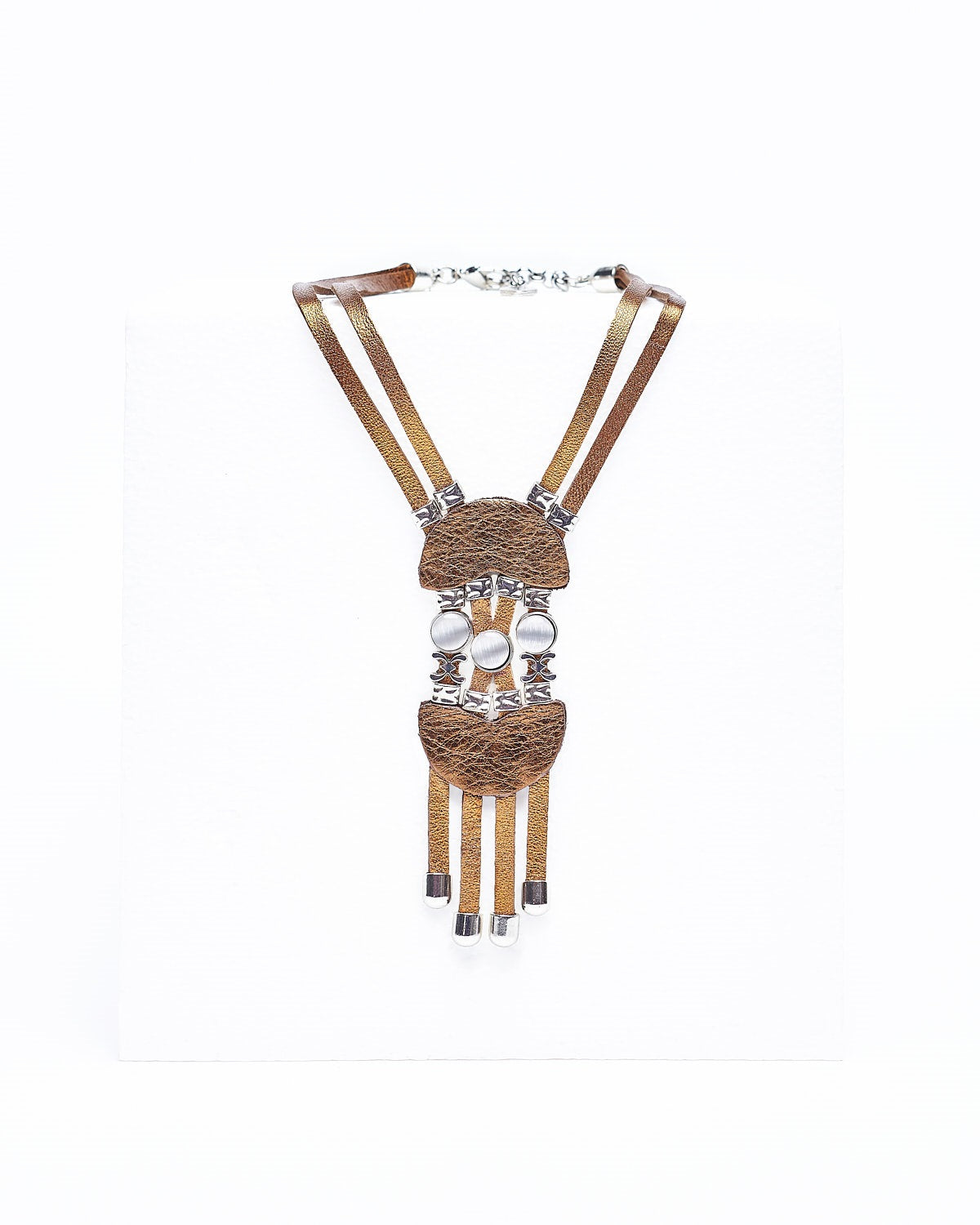 Fabricado con cuero metalizado de alta calidad, este collar presenta un impresionante colgante con piedras "ojo de gato blanco perla" y cuatro tiras colgantes acabadas en piezas bañadas en plata.