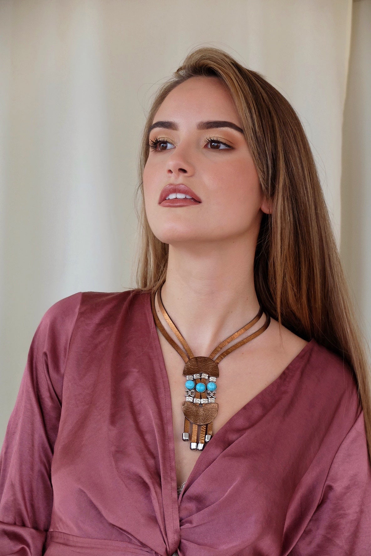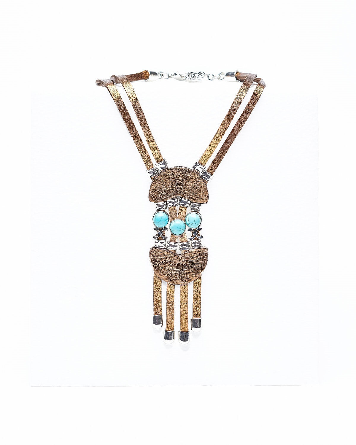 Una impresionante pieza confeccionada con suave cuero metalizado color bronce y un exótico colgante central adornado con cabujones de turquesas azules montadas sobre piezas plata y tiras metalizadas bronce acabadas en piezas plata.