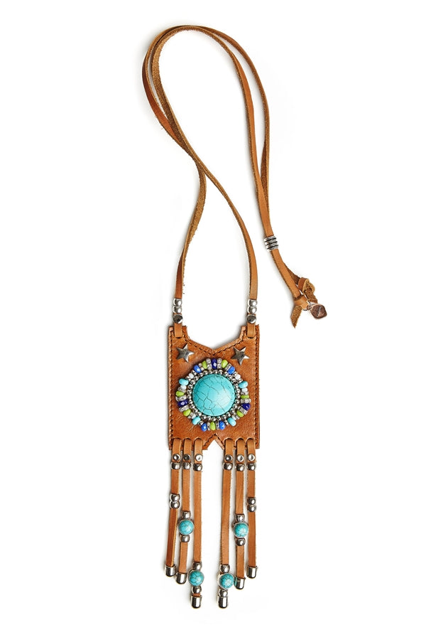 Las tiras de piel marrón decoradas con turquesas la hacen una alegría verdaderamente exótica y emocionante.