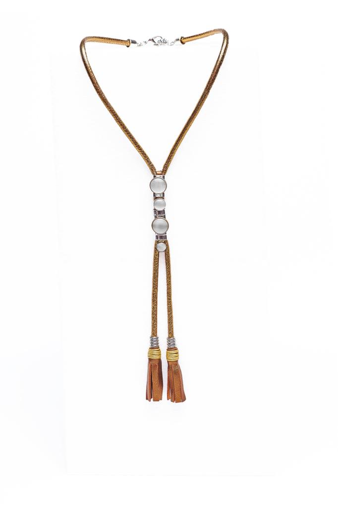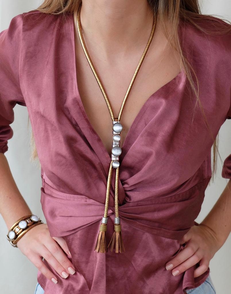 Su suave cordón de cuero dorado y sus terminaciones de flecos color bronce le dan un toque bohemio y moderno al mismo tiempo.