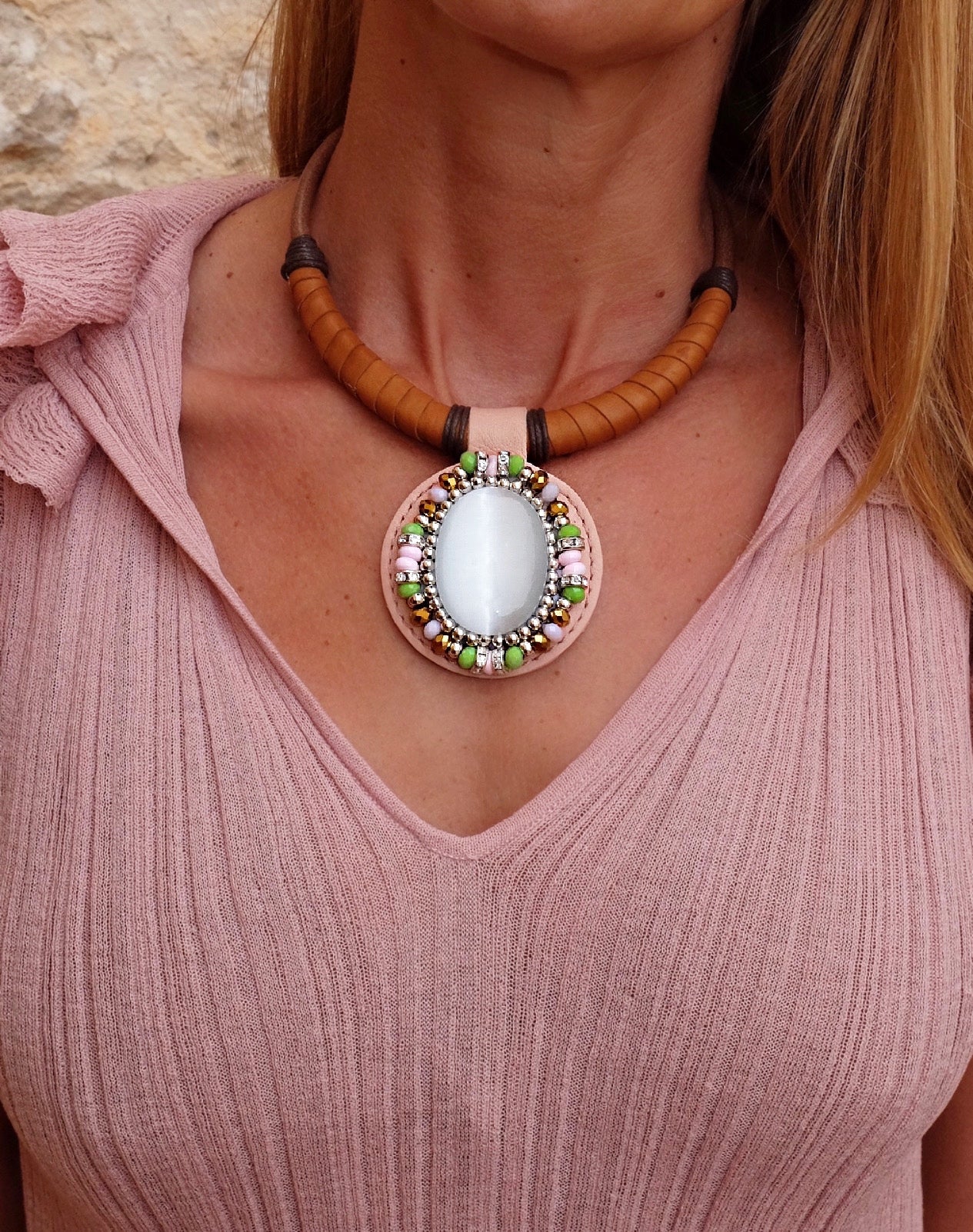 Con su diseño elaborado a mano, este collar combina la elegancia del cuero con la sofisticación de la piedra ojo de gato, rodeada de cristales y metal plata .