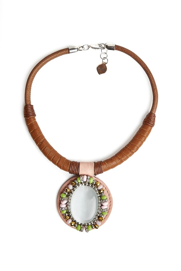 Con su cordón cosido y envuelto en cuero marrón y cierre metal plata, este collar es la elección perfecta para cualquier ocasión especial.