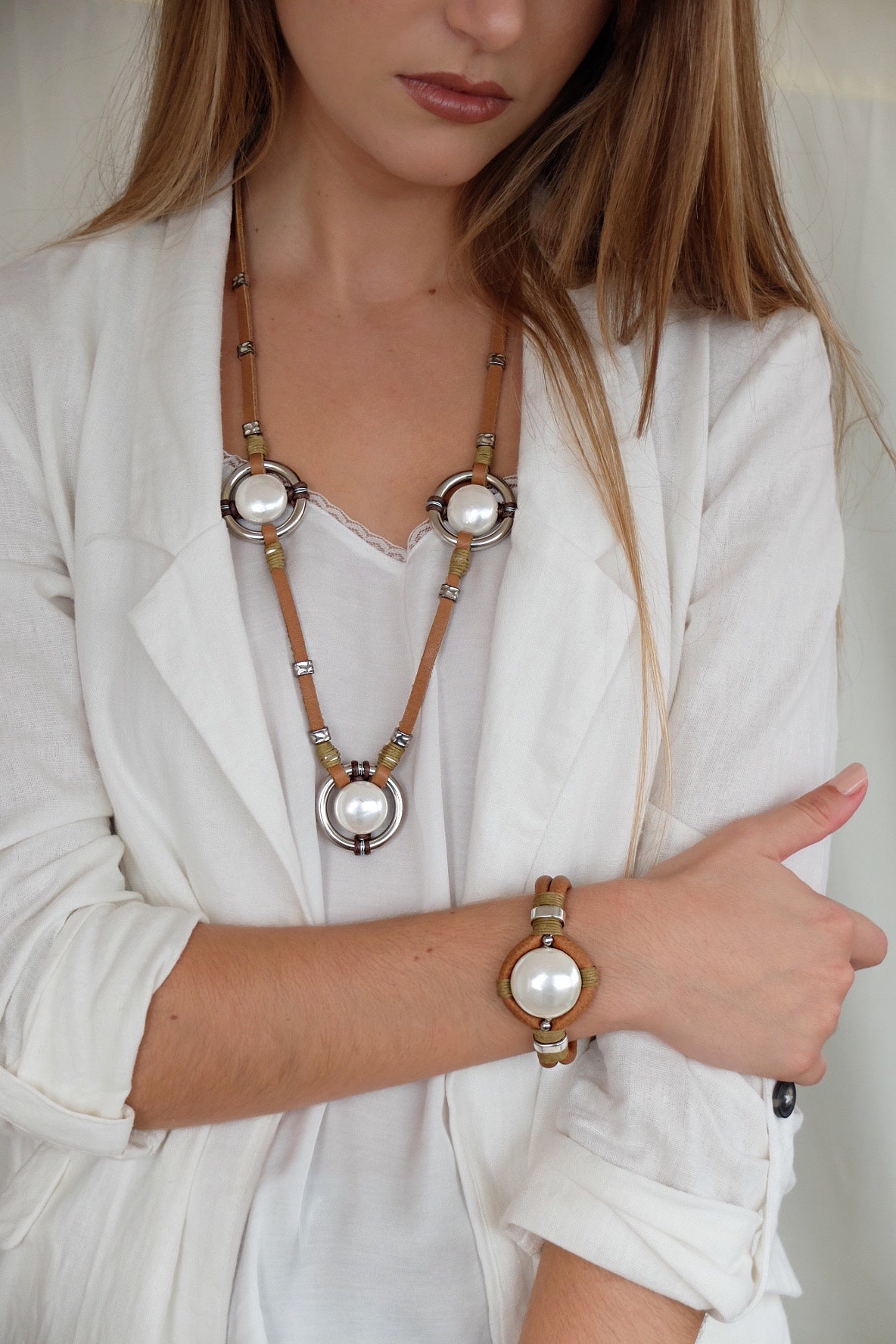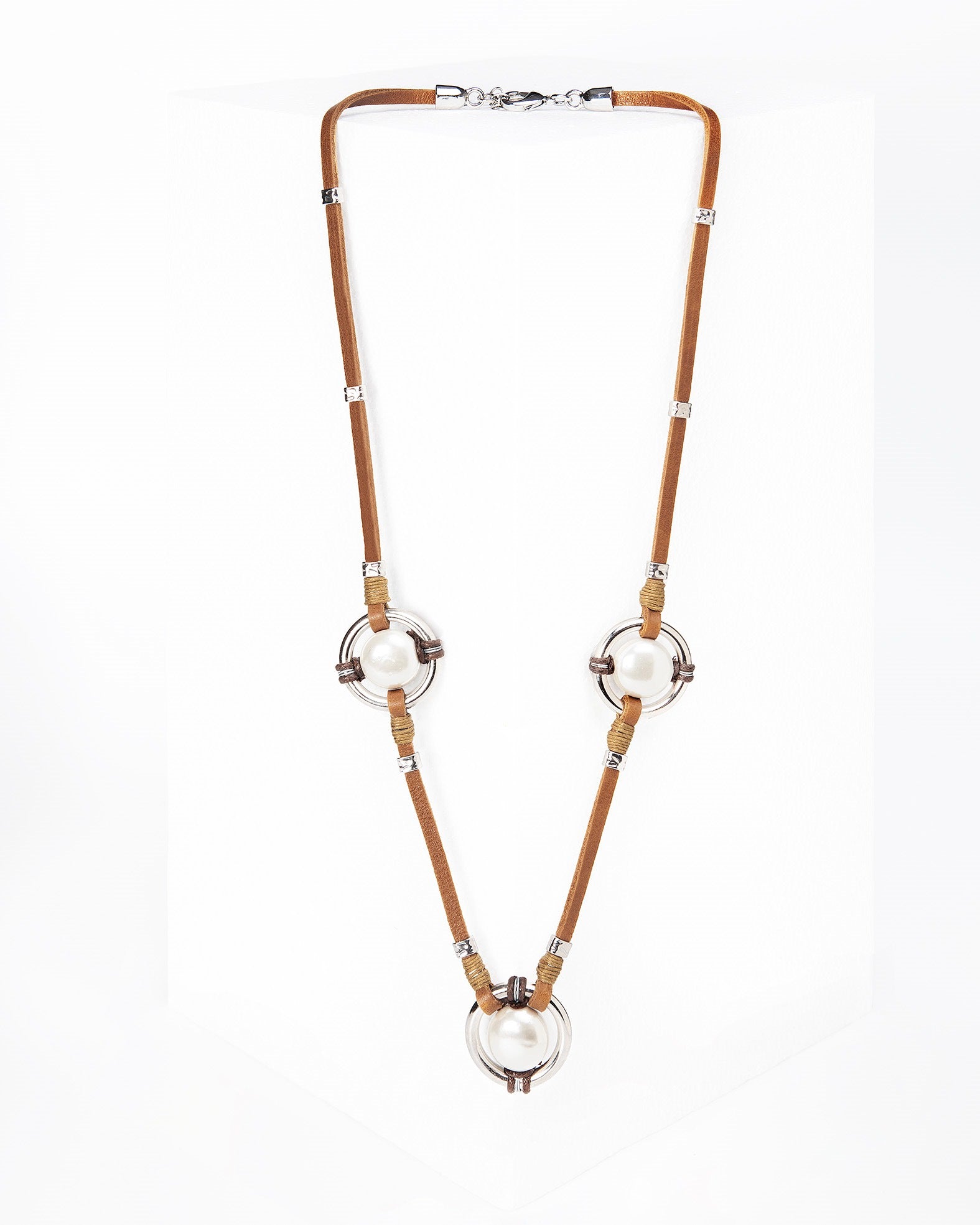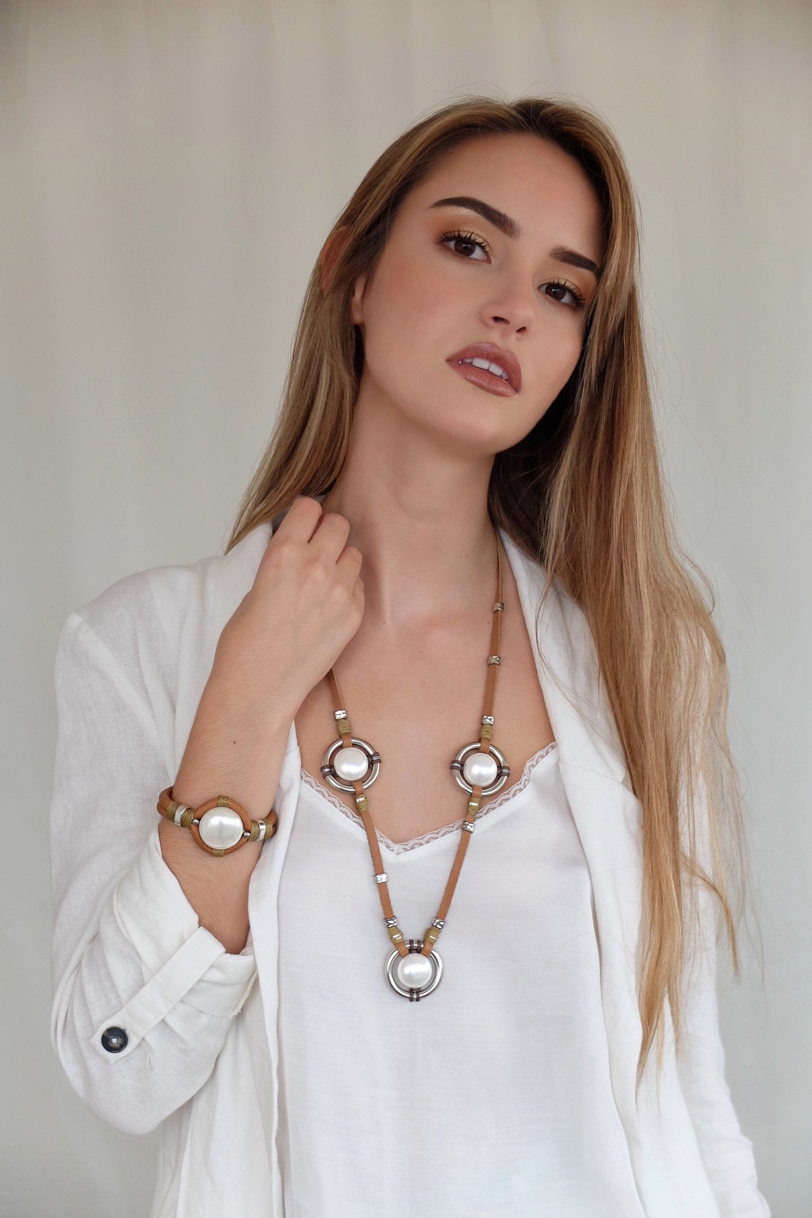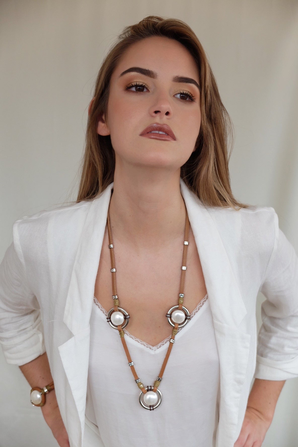 La perfecta mezcla de aros de metal bañado en plata y una preciosa perla de nácar, entrelazados con suave cuero marrón, hacen de esta joya una elección moderna y versátil para potenciar cualquier look.