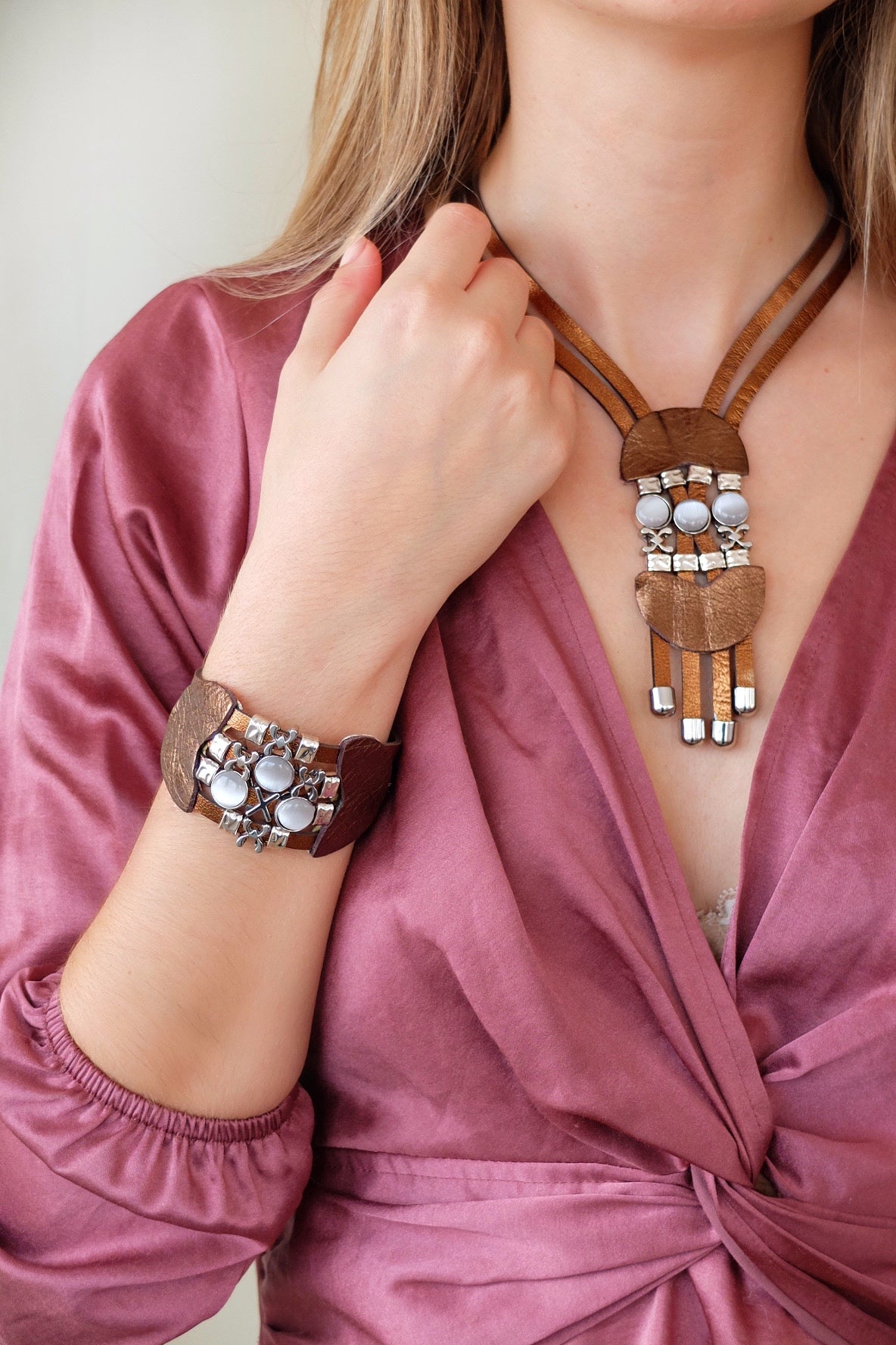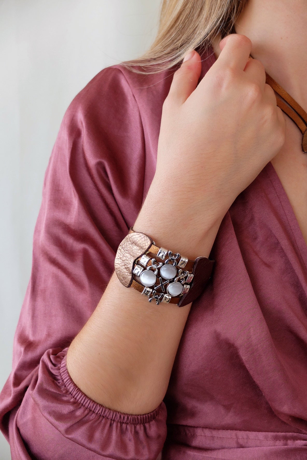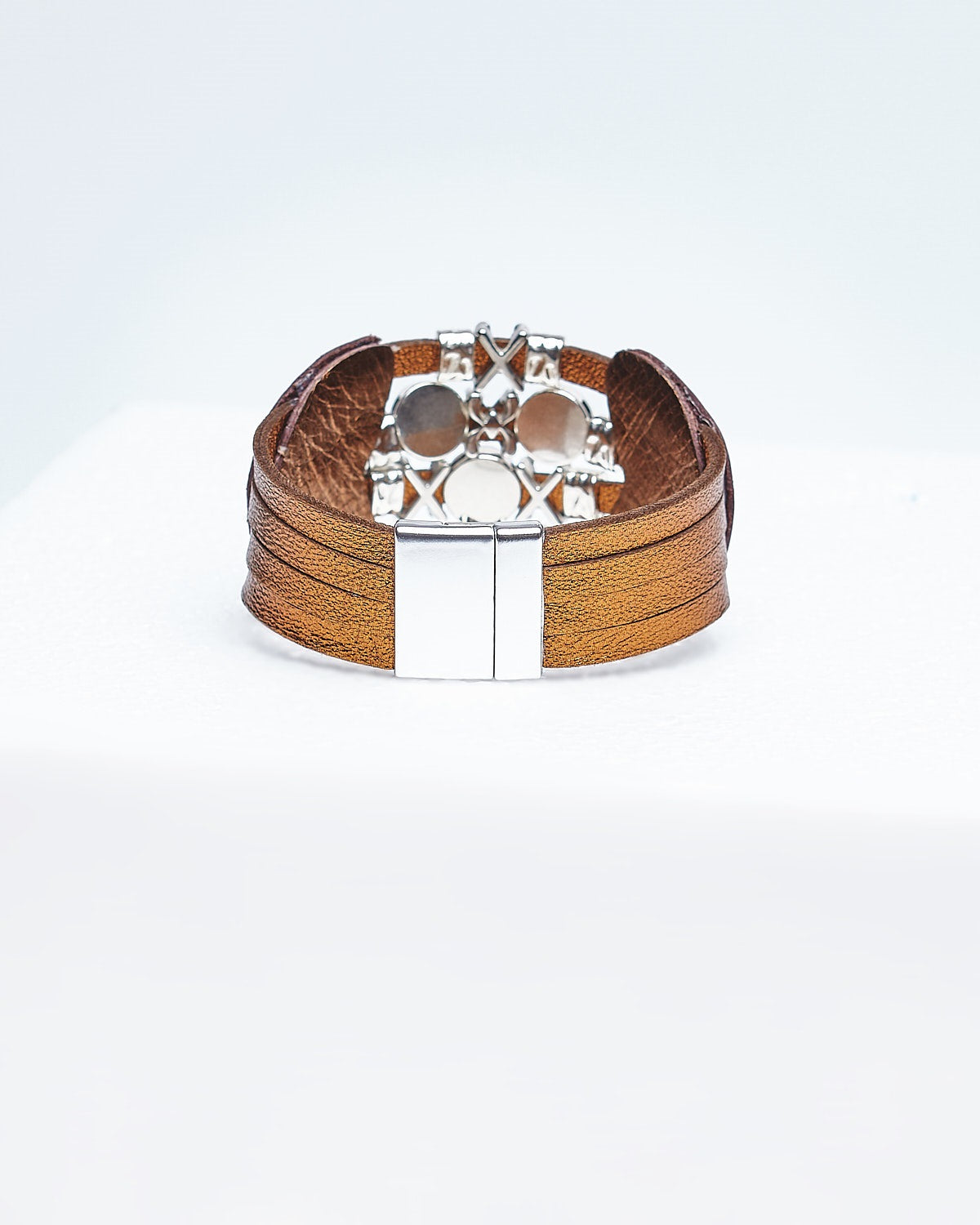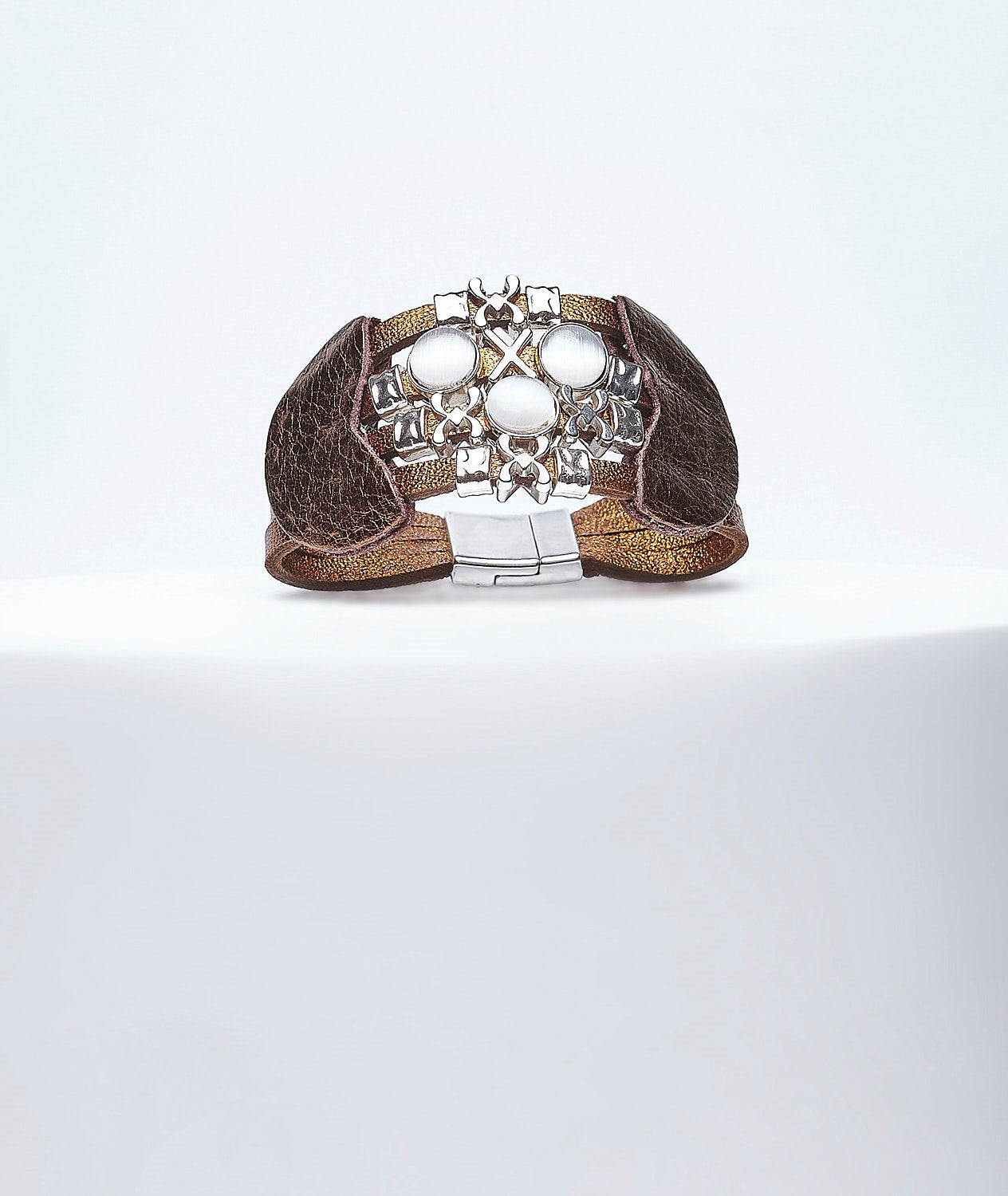 Hecha de cuero bronce metalizado, esta pulsera te brinda una comodidad incomparable y un estilo espectacular.