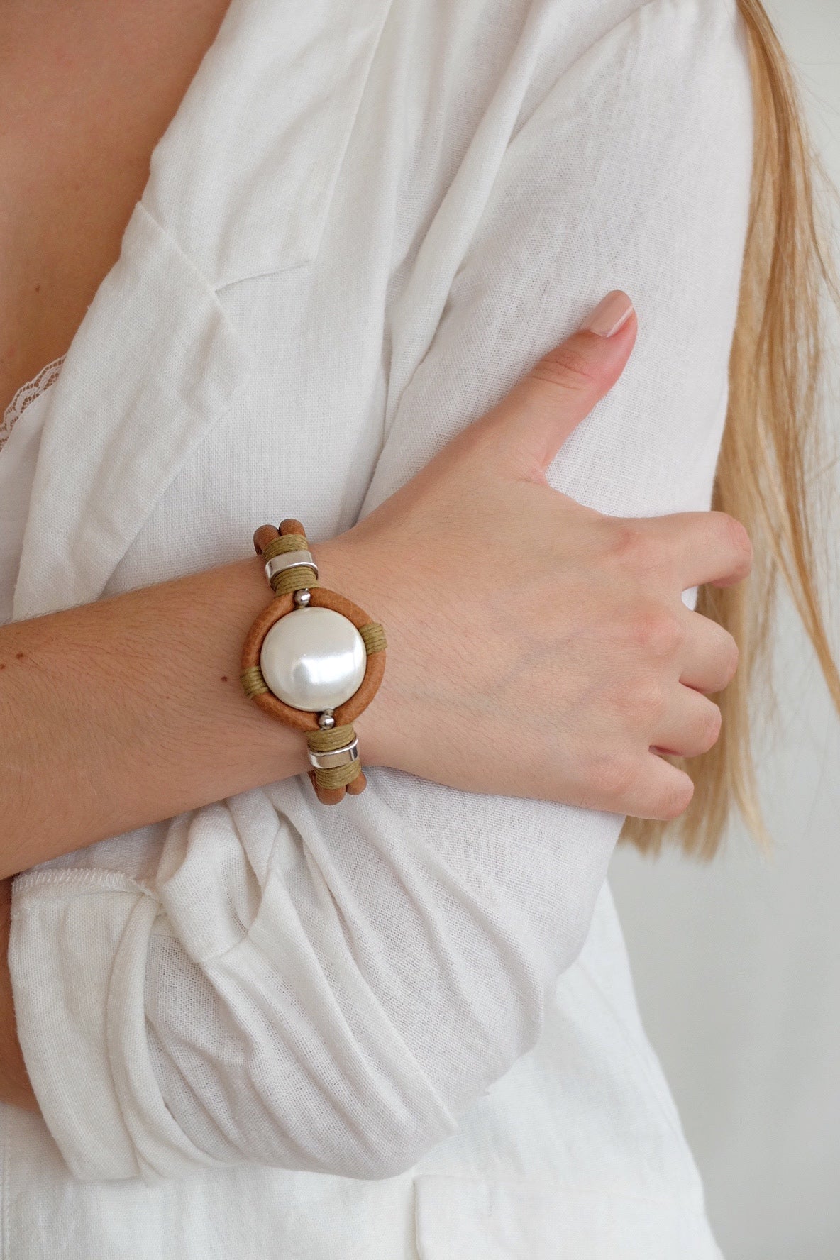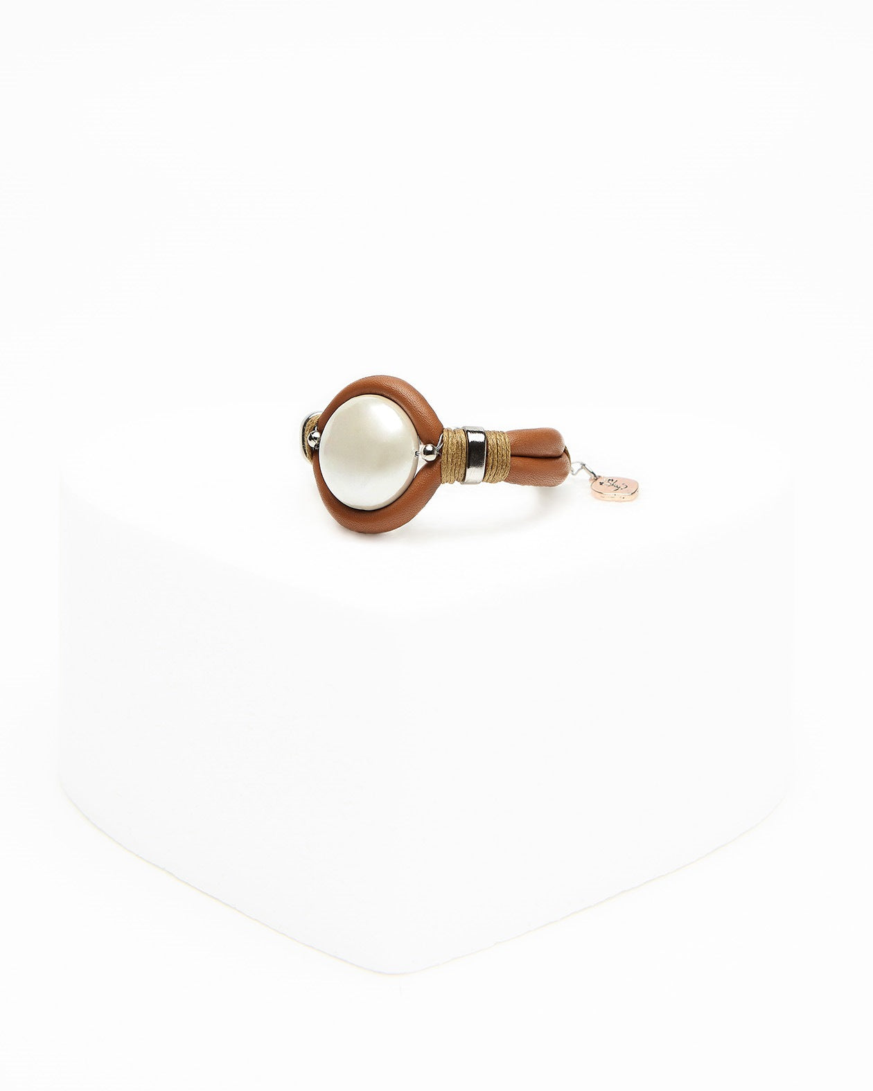 Con su elegante perla de nácar rodeada por un suave cordón de cuero marrón, esta pulsera se inspira en formas orgánicas y te aportará un toque de elegancia y ligereza en tu día a día.