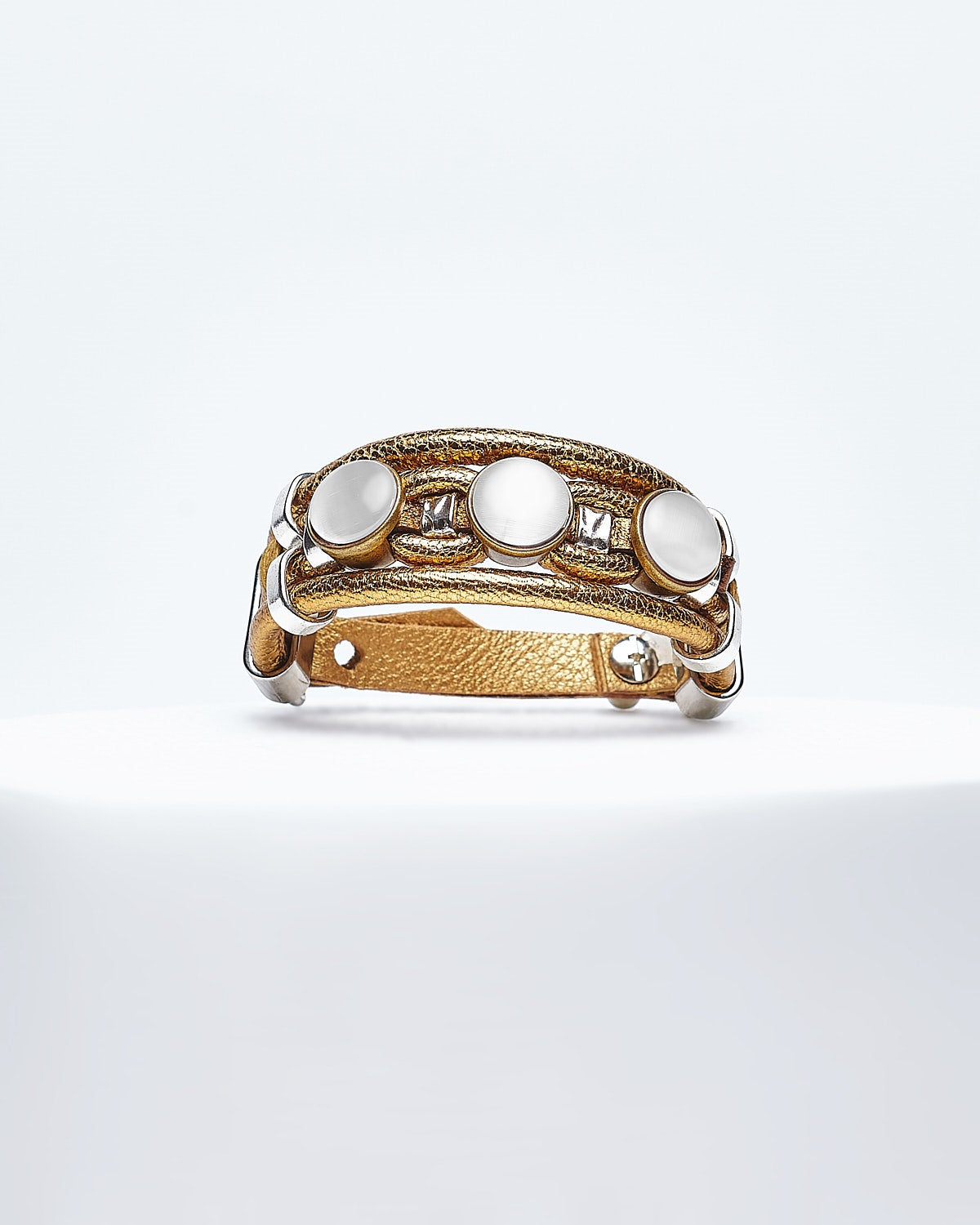 Joya de cuero metalizado y piedra de ojo de gato blanco para mujeres fuertes y decididas.
