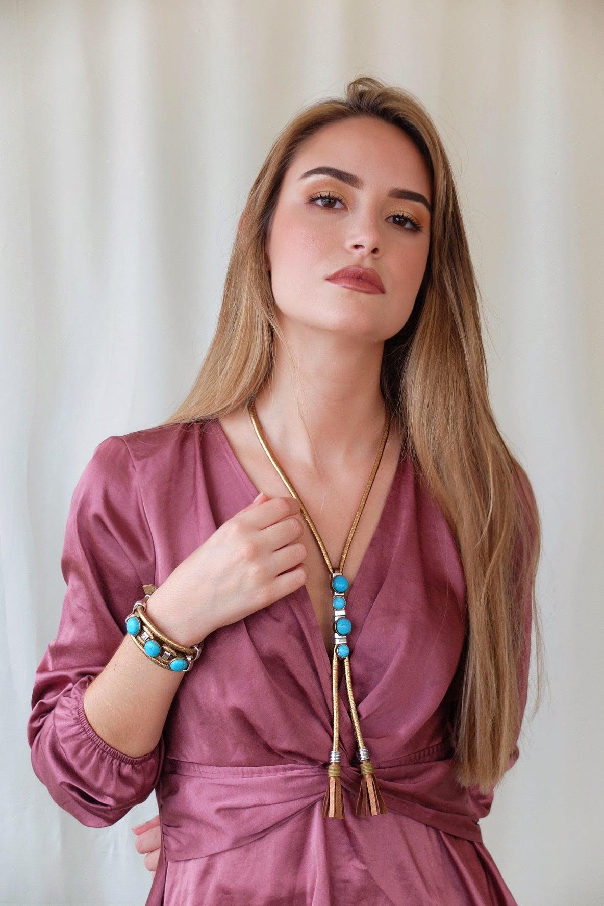 Cada detalle de la pulsera Orín ha sido cuidadosamente pensado para realzar la belleza natural de las turquesas y el cuero.