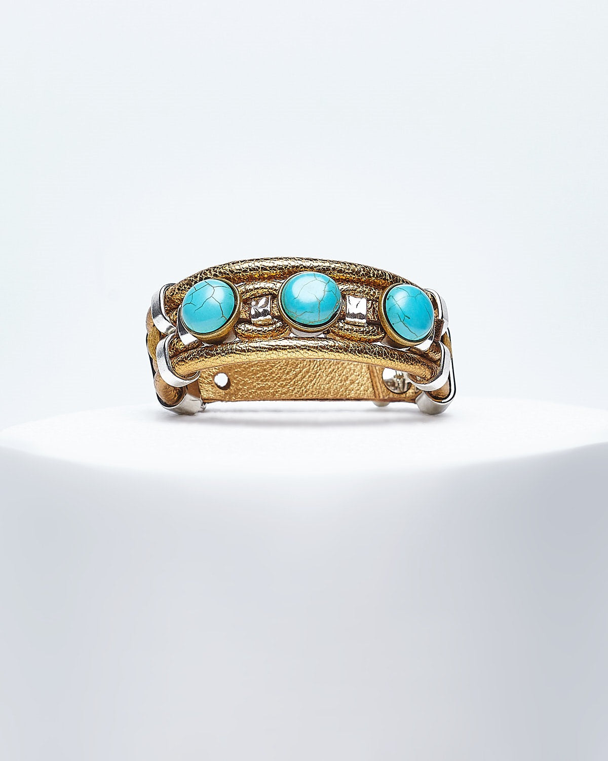 Esta pulsera de cuero oro y bronce con tres deslumbrante turquesas azules es impresionante.