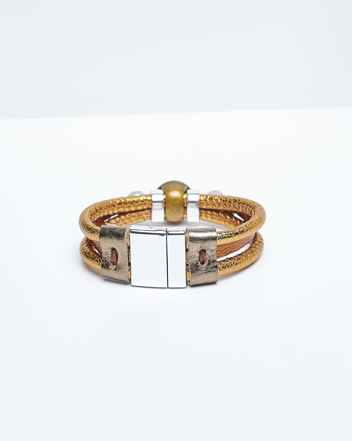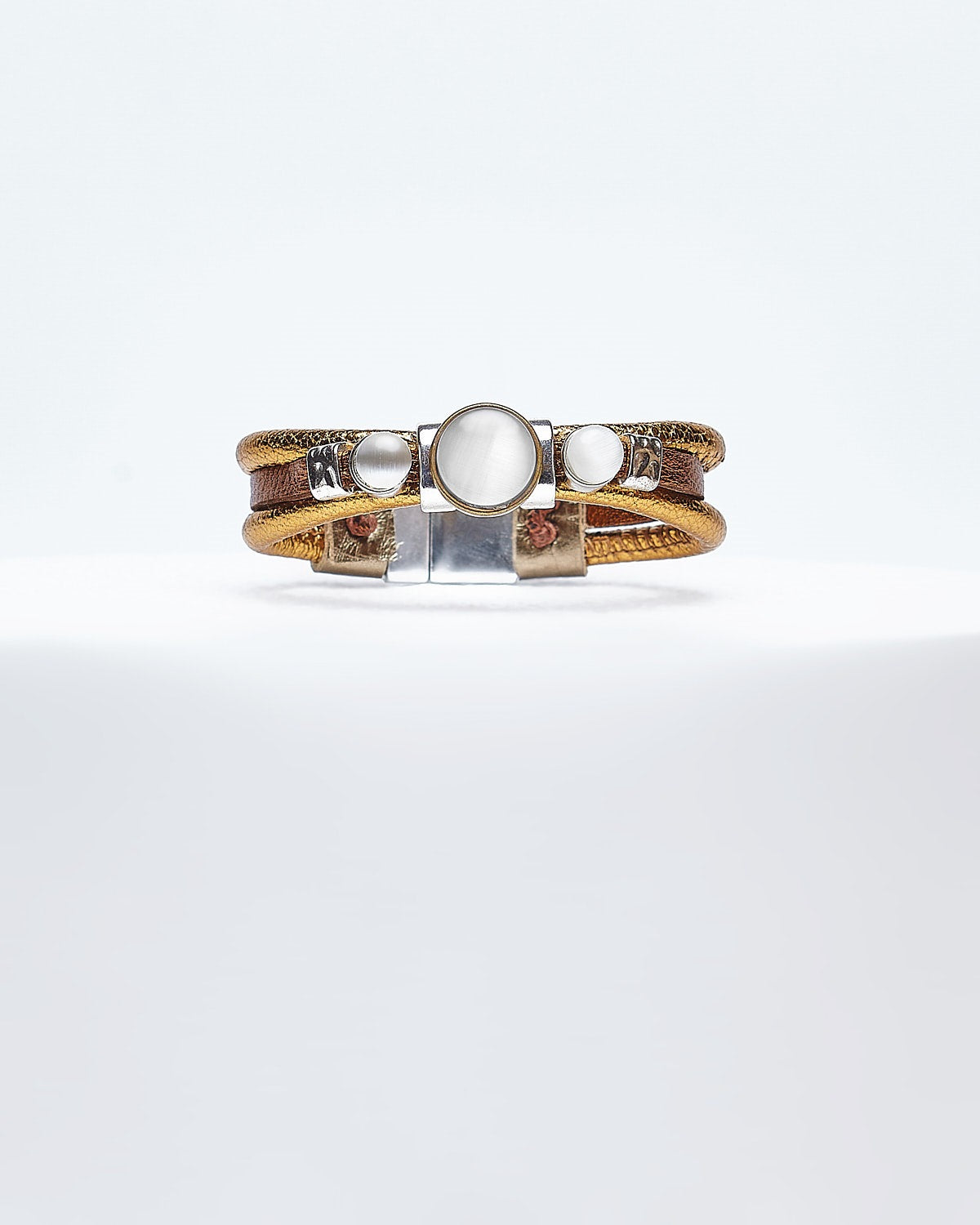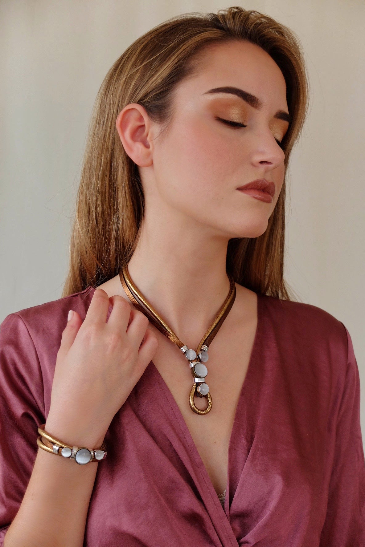 Esta pulsera de cuero oro y bronce metalizado, adornada con ojos de gato blanco perla, es una pieza única y hecha a mano en nuestros talleres de España.