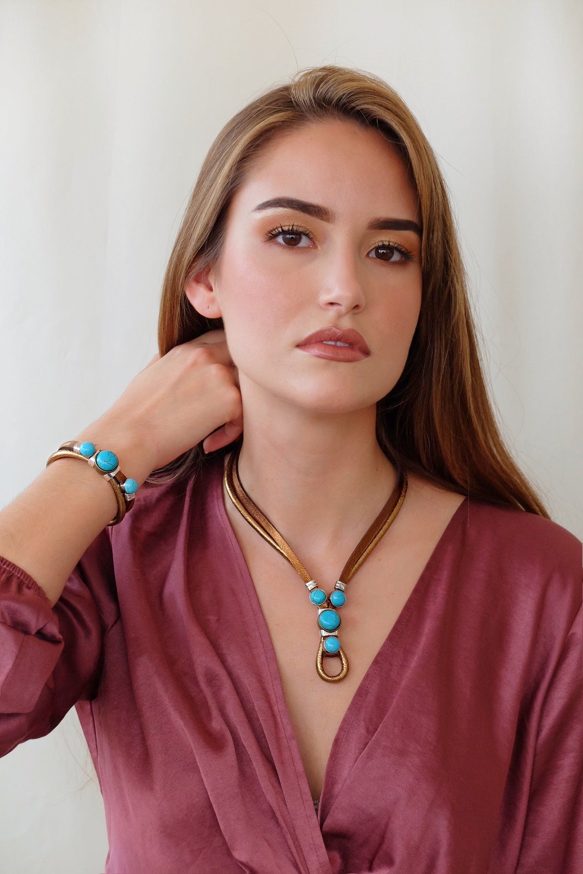 La pieza exclusiva de cuero oro con piedra turquesa que te hará sentir especial en cualquier ocasión.