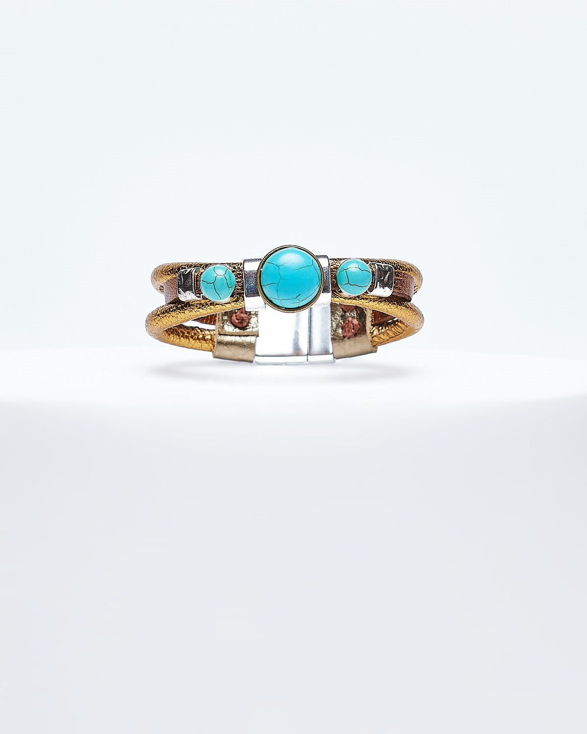 Sus tres brillantes piedras de turquesa en el centro atraen todas las miradas, mientras que su diseño de cuero oro y bronce metalizado complementan a la perfección cualquier outfit.