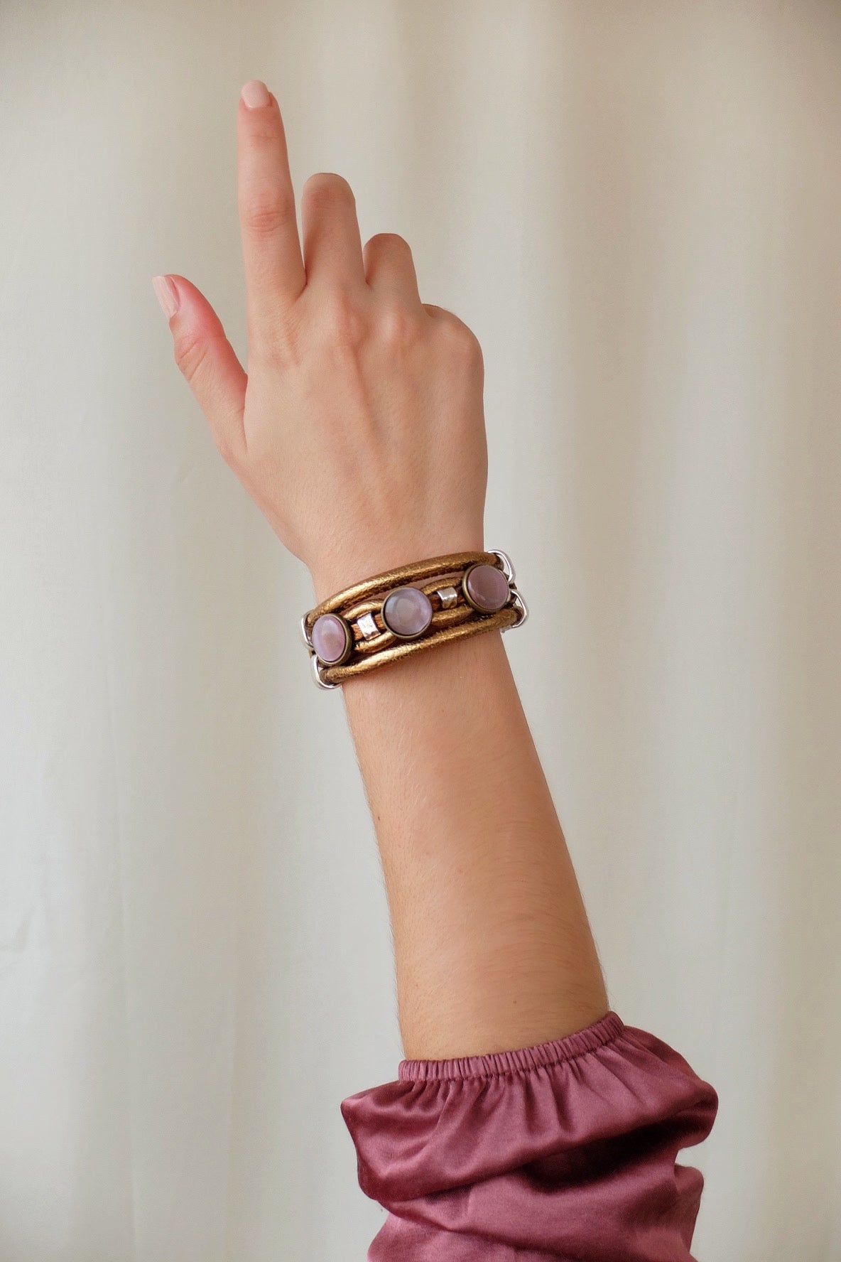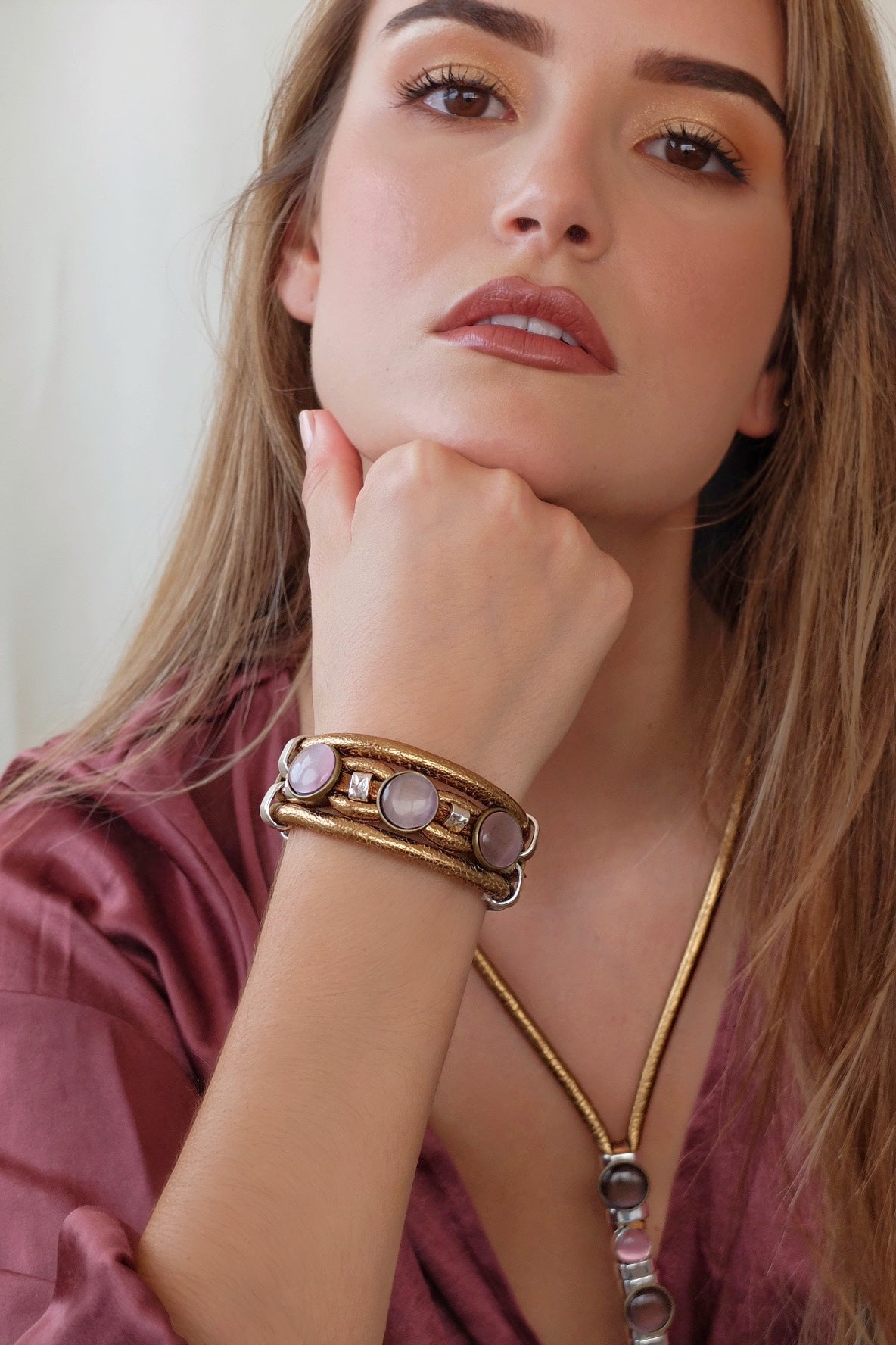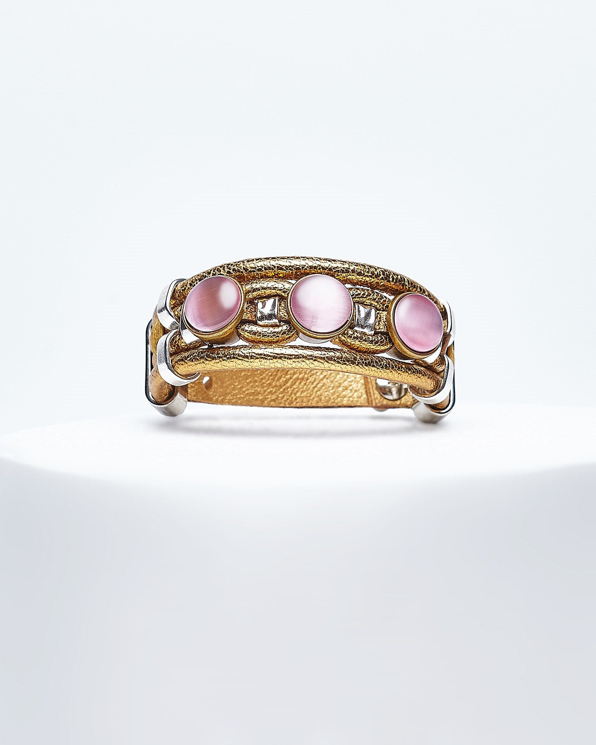 La Pulsera Odamia de cuero oro y bronce metalizado con piedras de ojo de gato rosa y piezas de plata hipoalergénica para mujer es la pieza que estaba buscando.