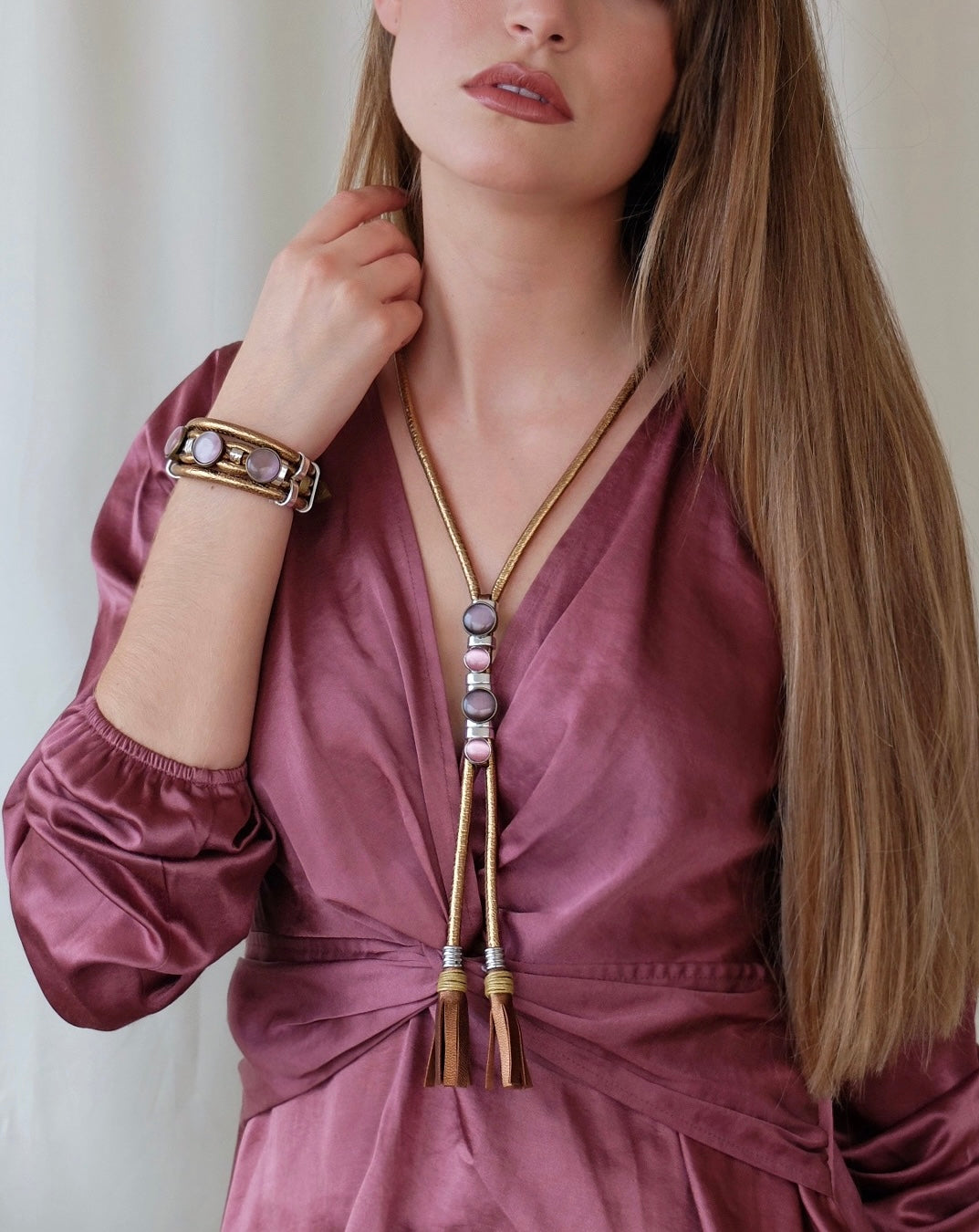 La comodidad que brinda esta pieza se debe a los materiales de alta calidad que la componen, como el cuero oro y bronce, el acabado metalizado que resalta y combina perfectamente con las piedras de ojo de gato rosa que la adornan.